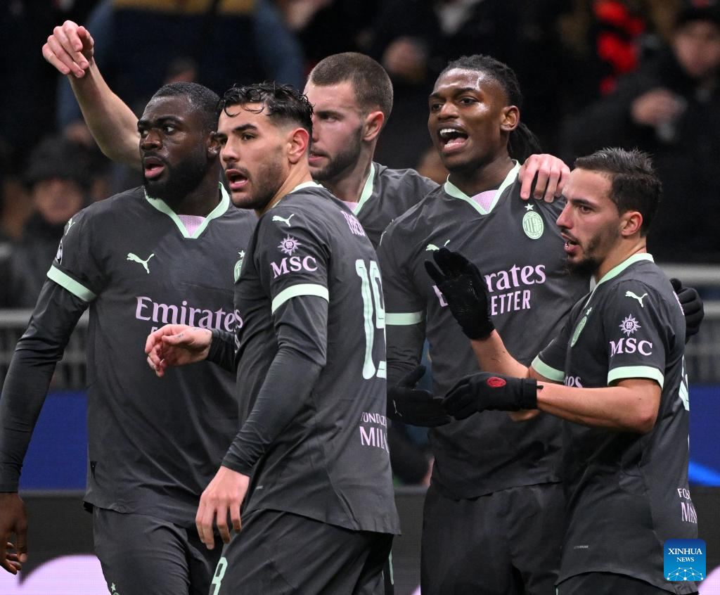 AC Milan's Rafael Leao (2nd R) celebrates his goal with teammates during the UEFA Champions League match between AC Milan and Girona in Milan, Italy, Jan. 22, 2025. (Photo by Alberto Lingria/Xinhua)