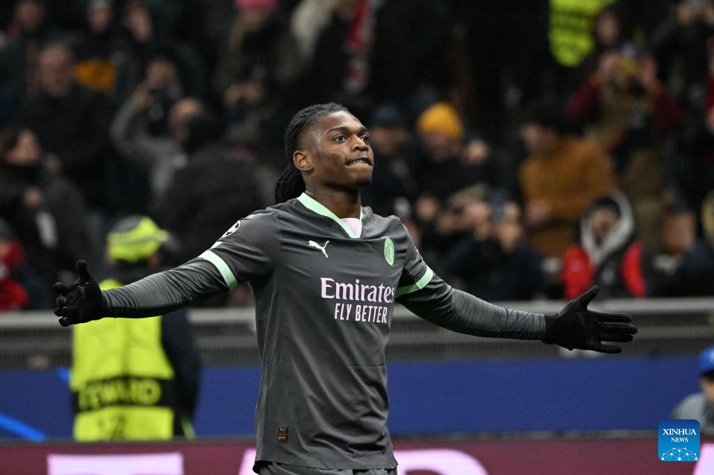 AC Milan's Rafael Leao celebrates his goal during the UEFA Champions League match between AC Milan and Girona in Milan, Italy, Jan. 22, 2025. (Photo by Alberto Lingria/Xinhua)