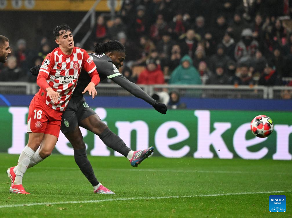 AC Milan's Rafael Leao (R) scores during the UEFA Champions League match between AC Milan and Girona in Milan, Italy, Jan. 22, 2025. (Photo by Alberto Lingria/Xinhua)