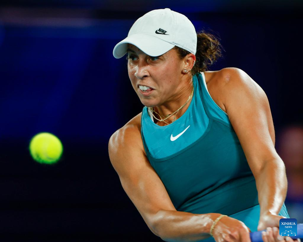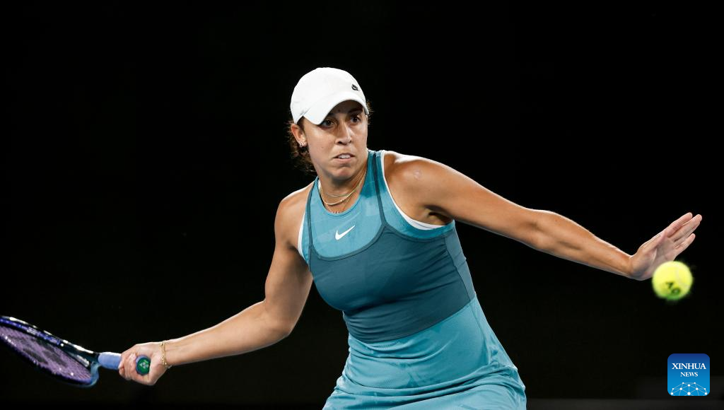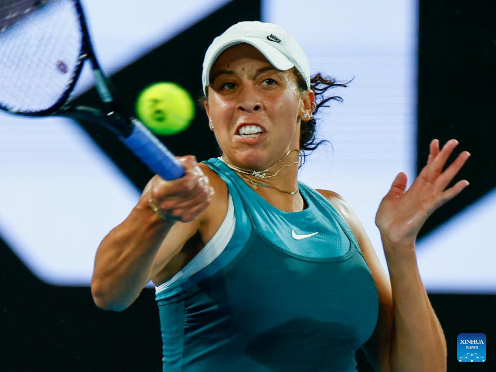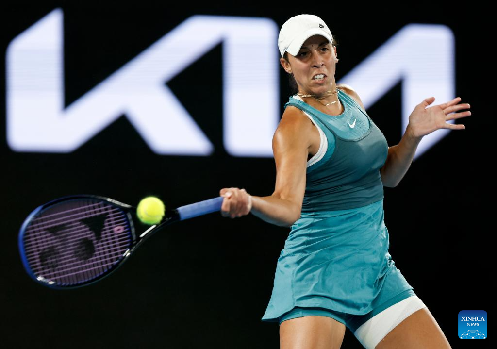 Madison Keys hits a return during the women's singles semifinal match between Iga Swiatek of Poland and Madison Keys of the United States at Australian Open tennis tournament in Melbourne, Australia, Jan. 23, 2025. (Xinhua/Ma Ping)