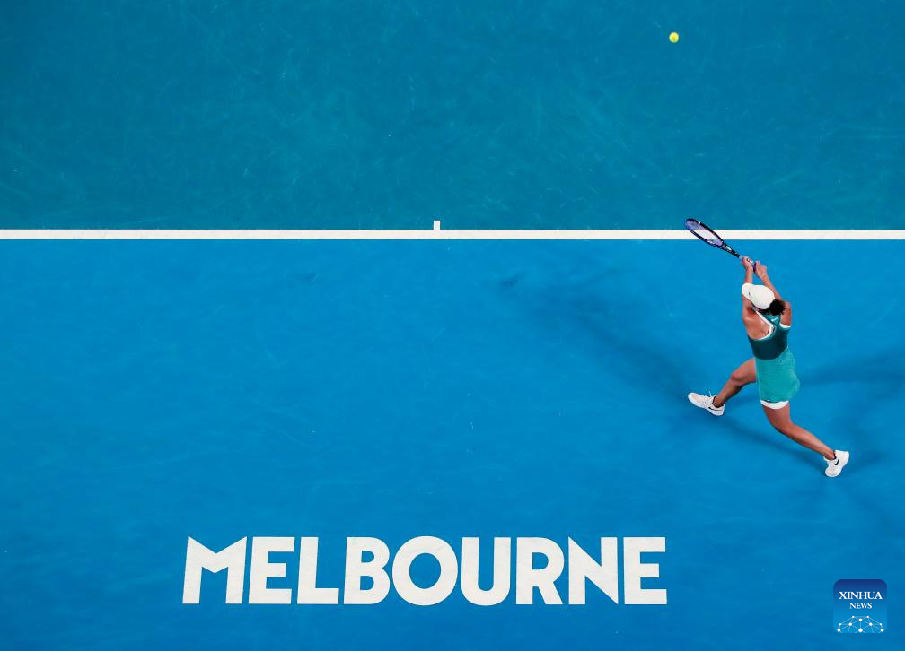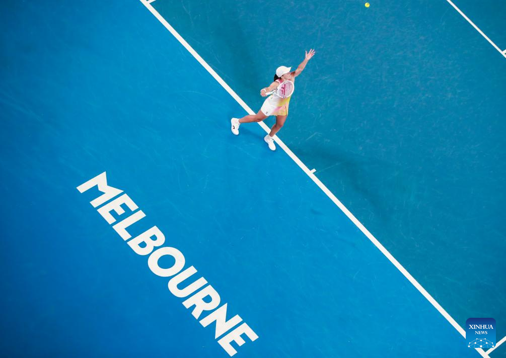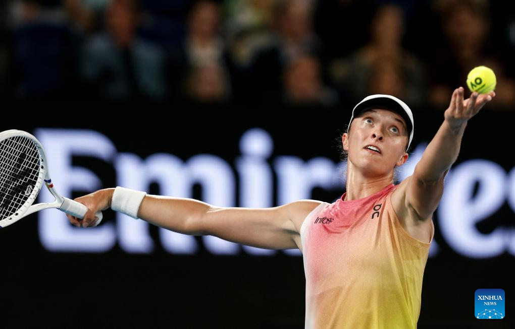 Iga Swiatek serves during the women's singles semifinal match between Iga Swiatek of Poland and Madison Keys of the United States at Australian Open tennis tournament in Melbourne, Australia, Jan. 23, 2025. (Xinhua/Ma Ping)