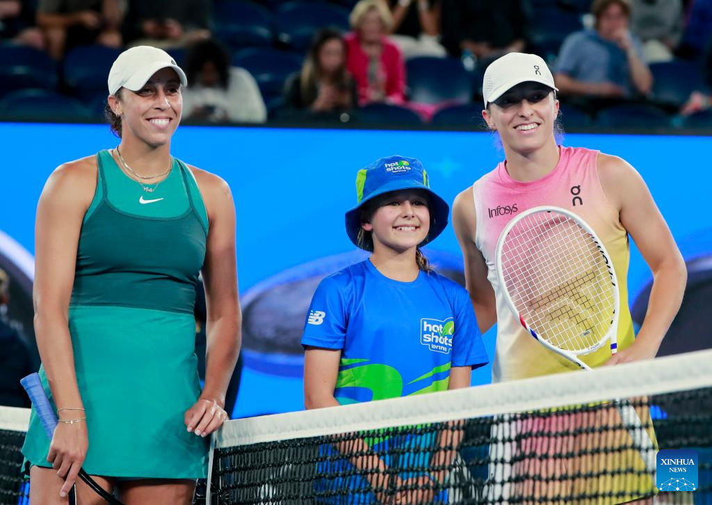 Madison Keys (L) and Iga Swiatek (R) pose for photos before the women's singles semifinal match between Iga Swiatek of Poland and Madison Keys of the United States at Australian Open tennis tournament in Melbourne, Australia, Jan. 23, 2025. (Xinhua/Ma Ping)