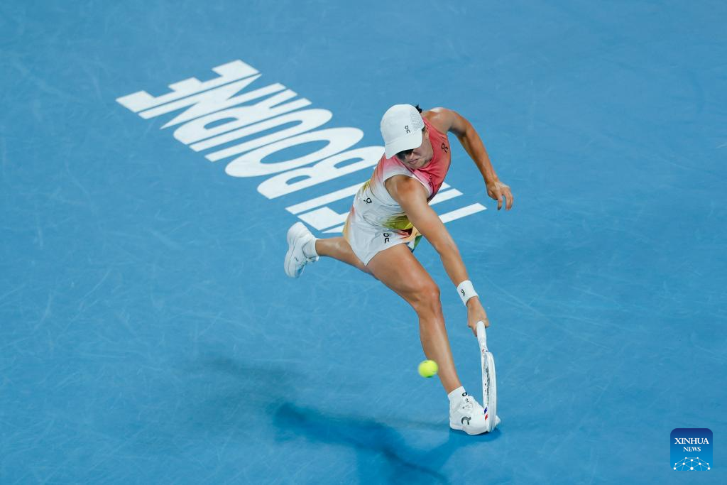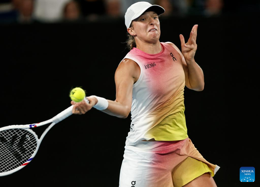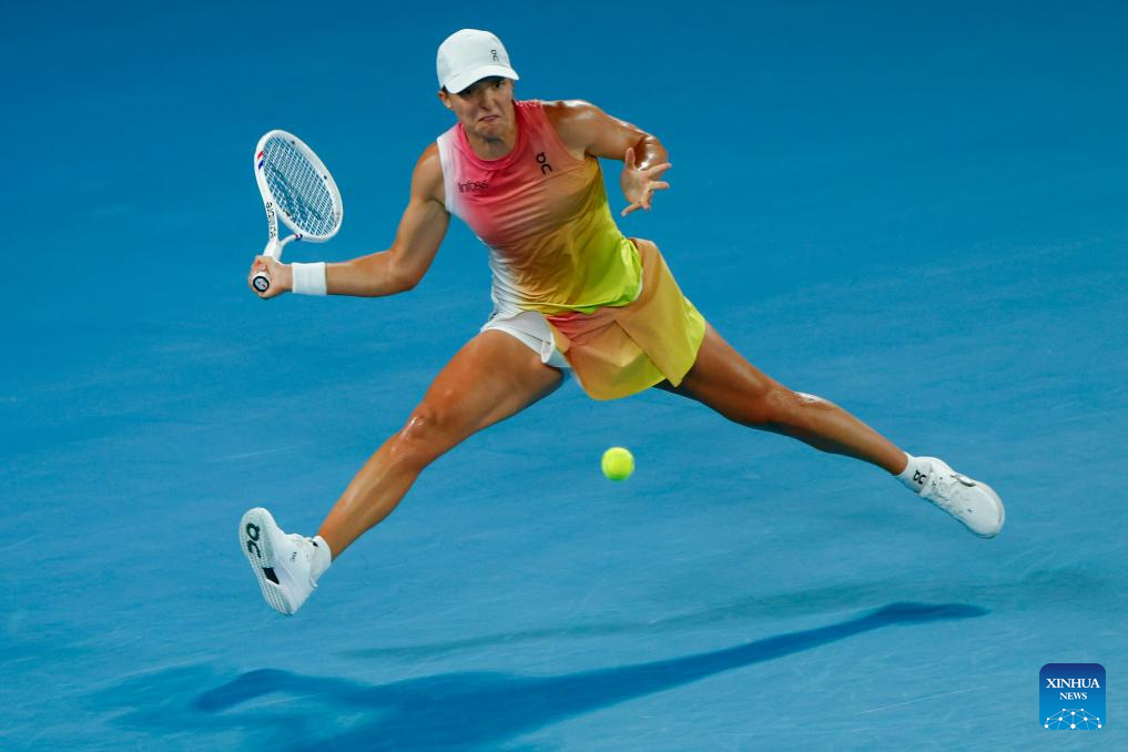 Iga Swiatek hits a return during the women's singles semifinal match between Iga Swiatek of Poland and Madison Keys of the United States at Australian Open tennis tournament in Melbourne, Australia, Jan. 23, 2025. (Xinhua/Ma Ping)