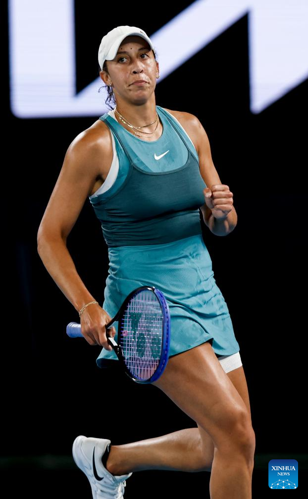 Madison Keys celebrates scoring during the women's singles semifinal match between Iga Swiatek of Poland and Madison Keys of the United States at Australian Open tennis tournament in Melbourne, Australia, Jan. 23, 2025. (Xinhua/Ma Ping)