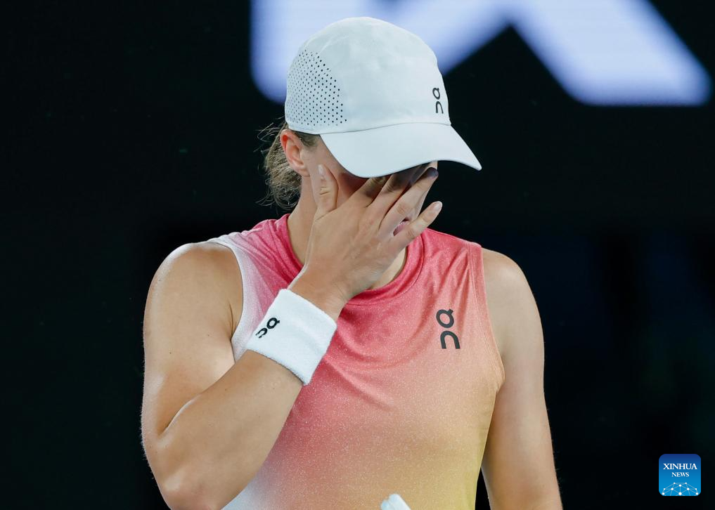 Iga Swiatek reacts during the women's singles semifinal between Iga Swiatek of Poland and Madison Keys of the United States at Australian Open tennis tournament in Melbourne, Australia, Jan. 23, 2025. (Photo by Chu Chen/Xinhua)