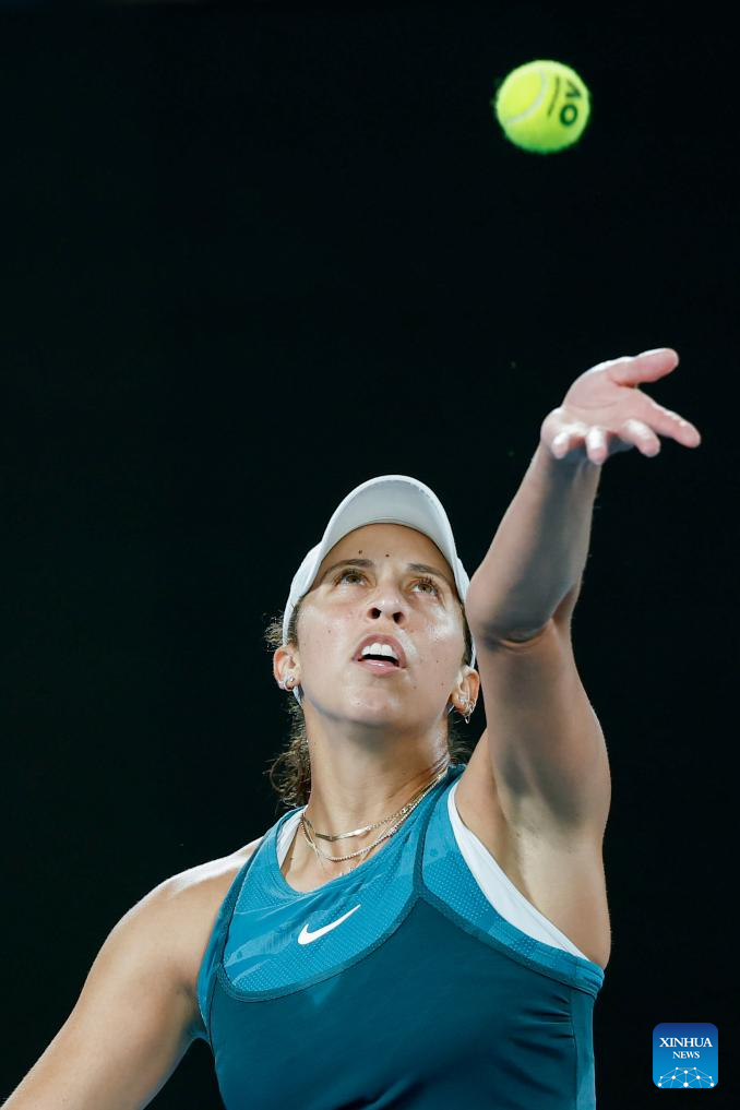 Madison Keys serves during the women's singles semifinal between Iga Swiatek of Poland and Madison Keys of the United States at Australian Open tennis tournament in Melbourne, Australia, Jan. 23, 2025. (Photo by Chu Chen/Xinhua)