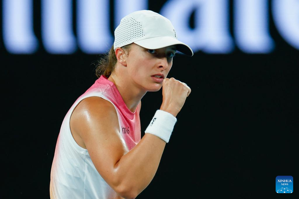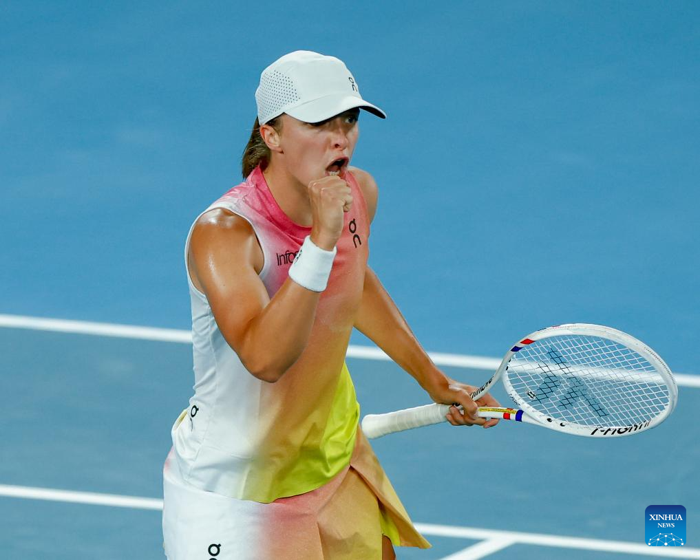Iga Swiatek celebrates scoring during the women's singles semifinal match between Iga Swiatek of Poland and Madison Keys of the United States at Australian Open tennis tournament in Melbourne, Australia, Jan. 23, 2025. (Xinhua/Ma Ping)