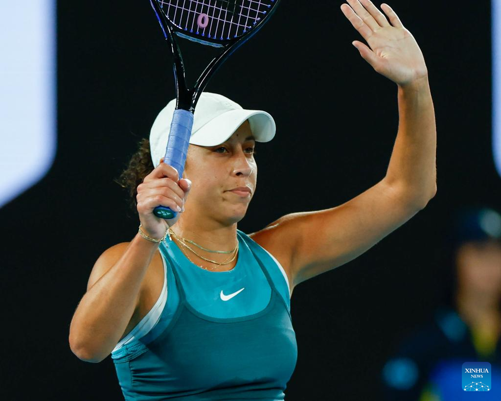 Madison Keys celebrates winning the women's singles semifinal match between Iga Swiatek of Poland and Madison Keys of the United States at Australian Open tennis tournament in Melbourne, Australia, Jan. 23, 2025. (Photo by Chu Chen/Xinhua)