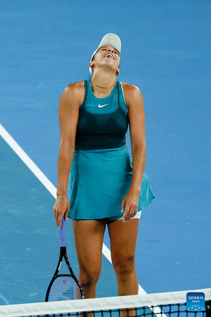 Madison Keys reacts during the women's singles semifinal between Iga Swiatek of Poland and Madison Keys of the United States at Australian Open tennis tournament in Melbourne, Australia, Jan. 23, 2025. (Photo by Chu Chen/Xinhua)