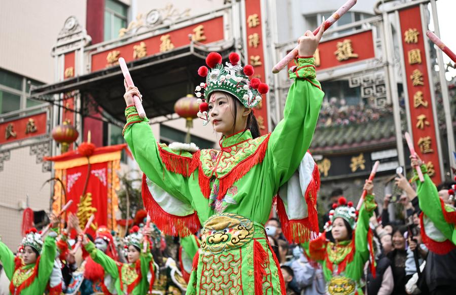 Members of a Yingge dance troupe stage a performance in Chaoyang District of Shantou City, south China's Guangdong Province, Jan. 23, 2025. (Xinhua/Deng Hua)