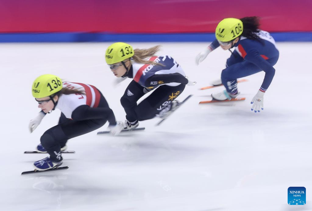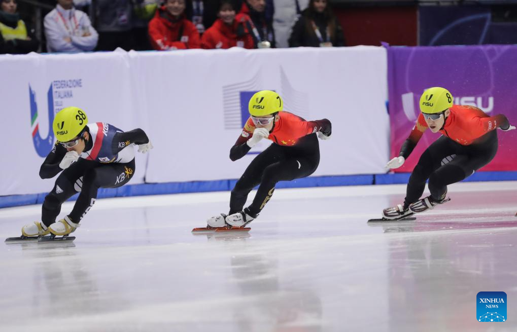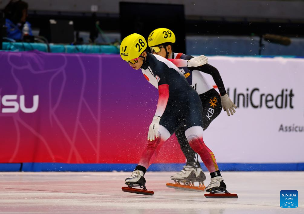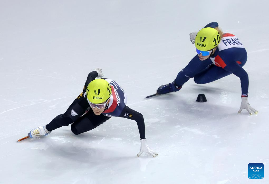 Kim Geonhee (C) of South Korea competes during the women's 500m heat of the short track speed skating competition at the Torino 2025 FISU World University Winter Games in Turin, Italy, Jan. 22, 2025. (Xinhua/Zhang Chen)