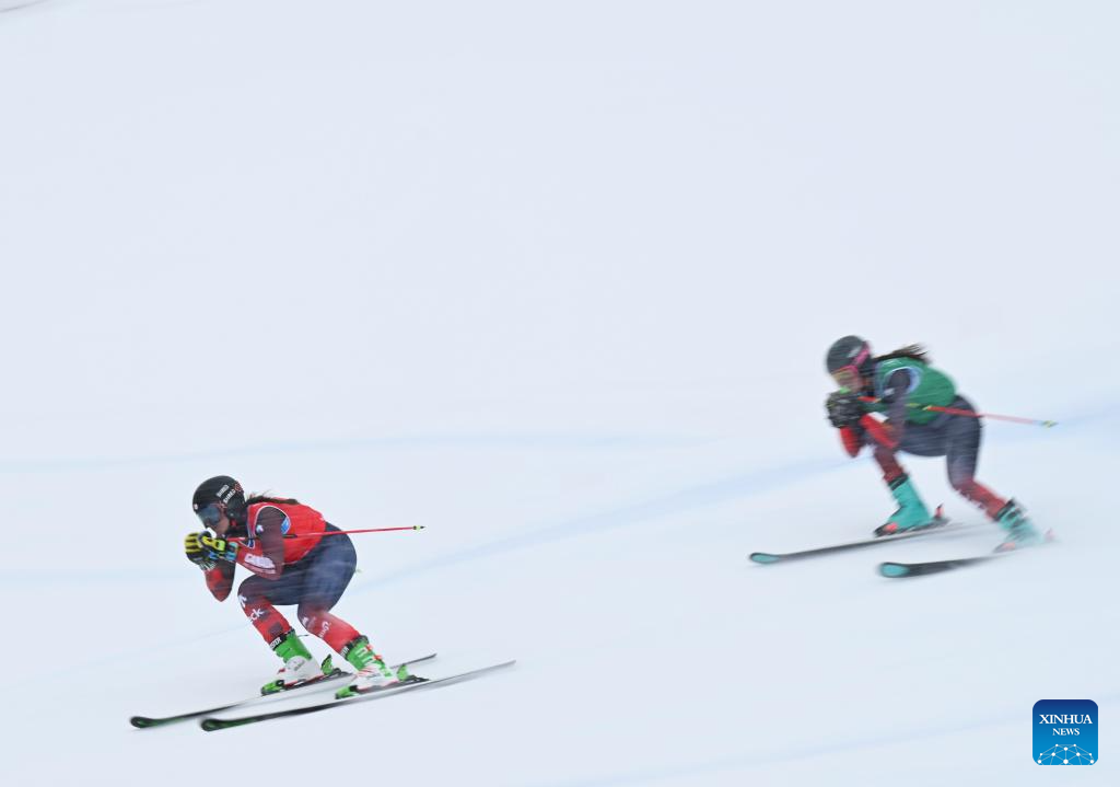 Sage Stefani (L) of Canada competes during the semifinal of the women's freestyle skiing ski cross competition at the 2025 FISU Winter World University Games in Bardonecchia, Italy, Jan. 22, 2025. (Xinhua/He Canling)