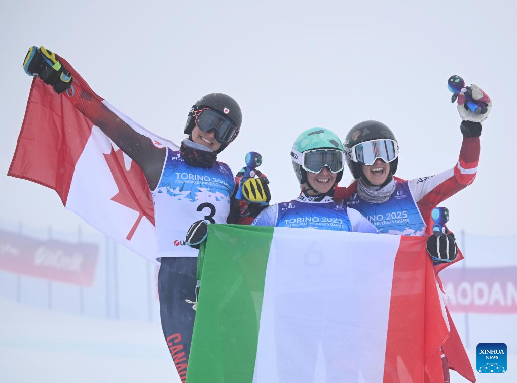 Gold medalist Nathalie Bernard (C) of Italy, silver medalist Isabel Hofherr (L) of Austria and bronze medalist Sage Stefani of Canada celebrate after the big final of the women's freestyle skiing ski cross competition at the 2025 FISU Winter World University Games in Bardonecchia, Italy, Jan. 22, 2025. (Xinhua/He Canling)