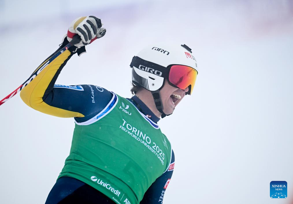 Erik Wahlberg of Sweden celebrates winning the big final of the men's freestyle skiing ski cross competition at the 2025 FISU Winter World University Games in Bardonecchia, Italy, Jan. 22, 2025. (Xinhua/He Canling)