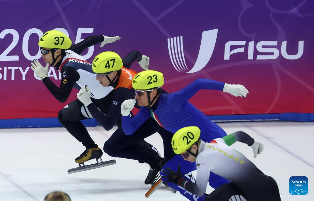 Bae Seochan (1st L) of South Korea competes during the men's 500m preliminary round of the short track speed skating competition at the 2025 FISU Winter World University Games in Turin, Italy, Jan. 22, 2025. (Xinhua/Zhang Chen)