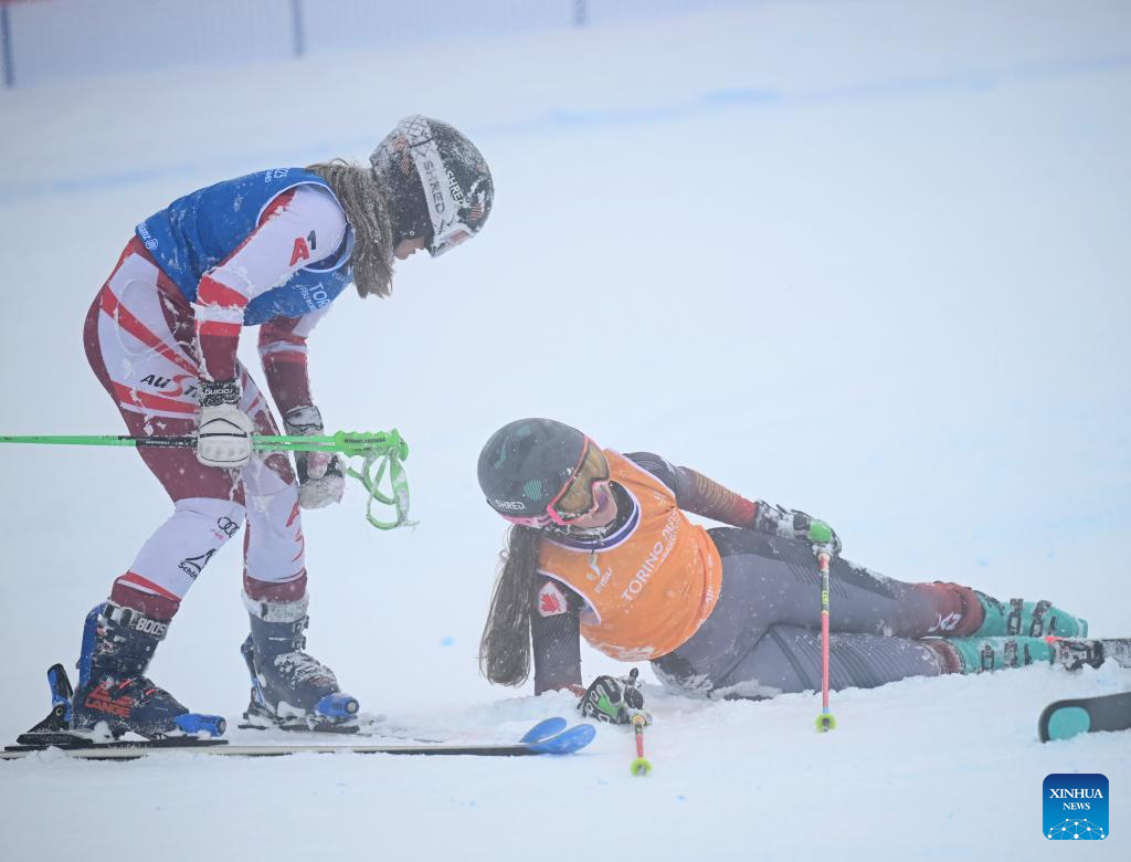Anne-Marie Joncas (R) of Canada lies on the ground after crossing the finish line during the big final of the women's freestyle skiing ski cross competition at the 2025 FISU Winter World University Games in Bardonecchia, Italy, Jan. 22, 2025. (Xinhua/He Canling)