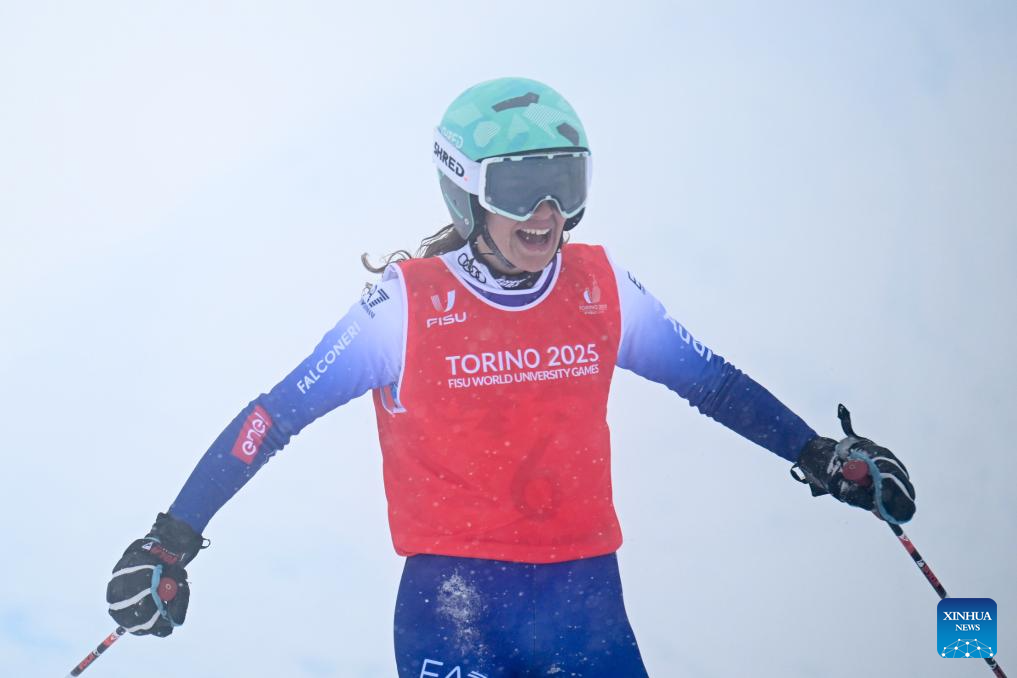 Nathalie Bernard of Italy celebrates after crossing the finish line during the big final of the women's freestyle skiing ski cross competition at the 2025 FISU Winter World University Games in Bardonecchia, Italy, Jan. 22, 2025. (Xinhua/He Canling)