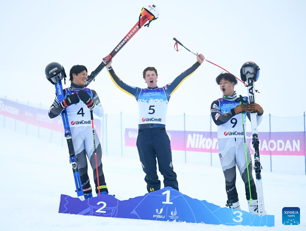 Gold medalist Erik Wahlberg (C) of Sweden, silver medalist Sasaoka Sora (L) of Japan and bronze medalist Asakawa Yamato of Japan celebrate after the big final of the men's freestyle skiing ski cross competition at the 2025 FISU Winter World University Games in Bardonecchia, Italy, Jan. 22, 2025. (Xinhua/He Canling)