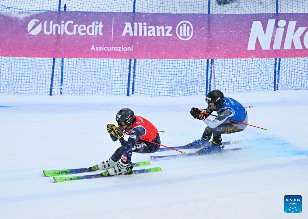 Jack James Mitchell (L) of the United States competes during the semifinal of the men's freestyle skiing ski cross competition at the 2025 FISU Winter World University Games in Bardonecchia, Italy, Jan. 22, 2025. (Xinhua/He Canling)