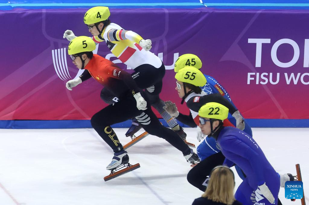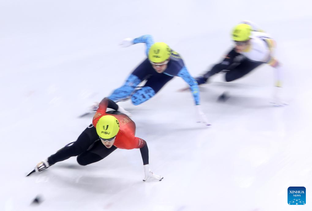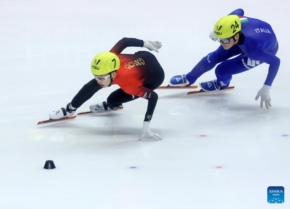 Zhang Tianyi (C) of China competes during the men's 500m preliminary round of the short track speed skating competition at the 2025 FISU Winter World University Games in Turin, Italy, Jan. 22, 2025. (Xinhua/Zhang Chen)