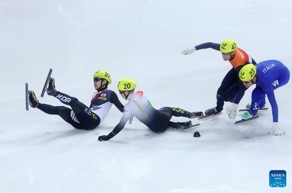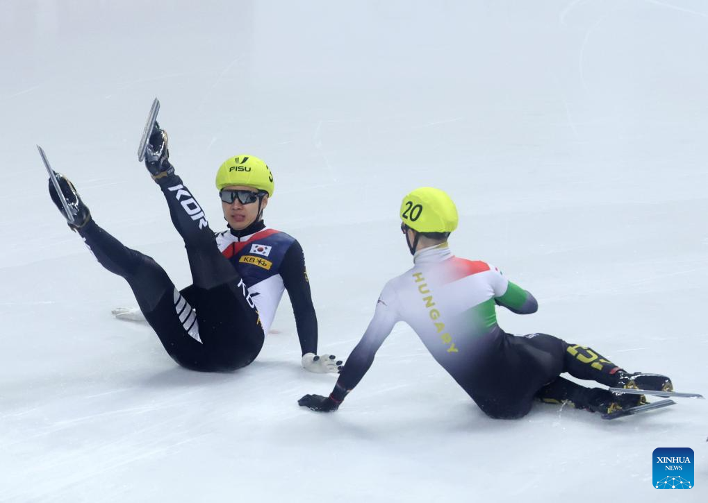 Bae Seochan (1st L) of South Korea and Adam Jozsef Gerecze (2nd L) of Hungary fall down during the men's 500m preliminary round of the short track speed skating competition at the 2025 FISU Winter World University Games in Turin, Italy, Jan. 22, 2025. (Xinhua/Zhang Chen)