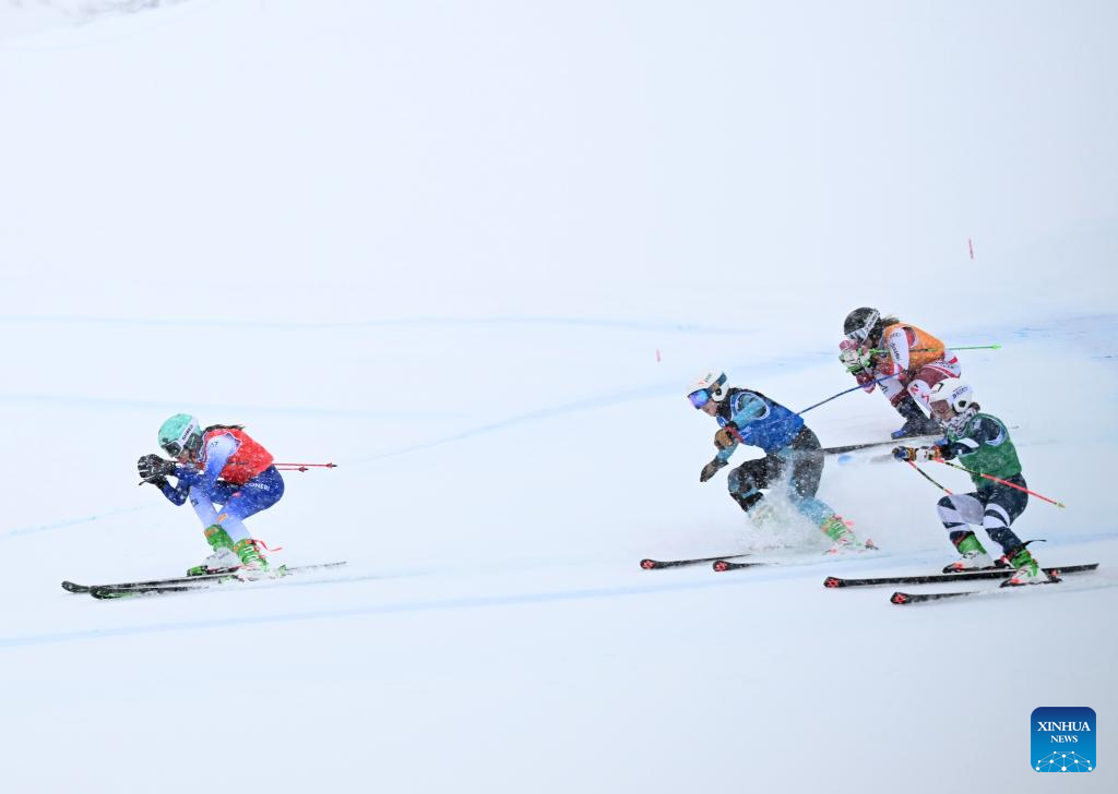 Nathalie Bernard (1st L) of Italy competes during the semifinal of the women's freestyle skiing ski cross competition at the 2025 FISU Winter World University Games in Bardonecchia, Italy, Jan. 22, 2025. (Xinhua/He Canling)