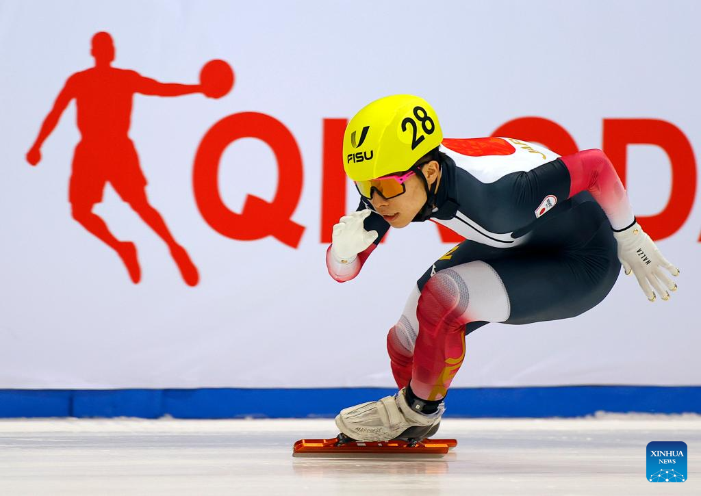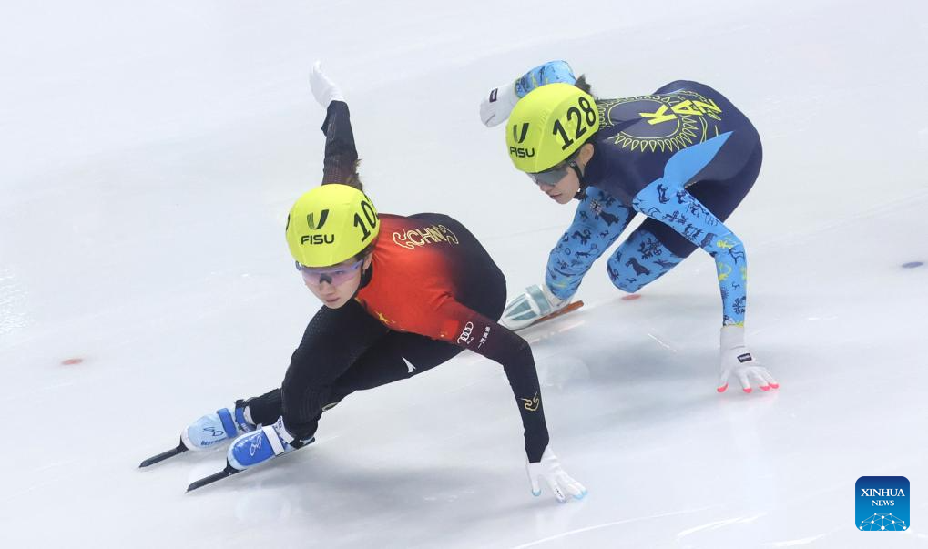 Song Yifei (L) of China competes during the women's 500m heat of the short track speed skating competition at the Torino 2025 FISU World University Winter Games in Turin, Italy, Jan. 22, 2025. (Xinhua/Zhang Chen)