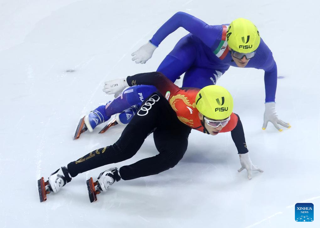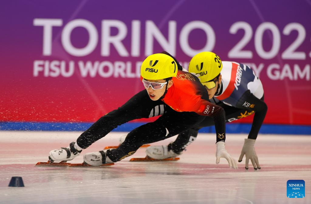 Song Guixu (R) of China competes during the men's 500m preliminary round of the short track speed skating competition at the 2025 FISU Winter World University Games in Turin, Italy, Jan. 22, 2025. (Xinhua/Zhang Chen)