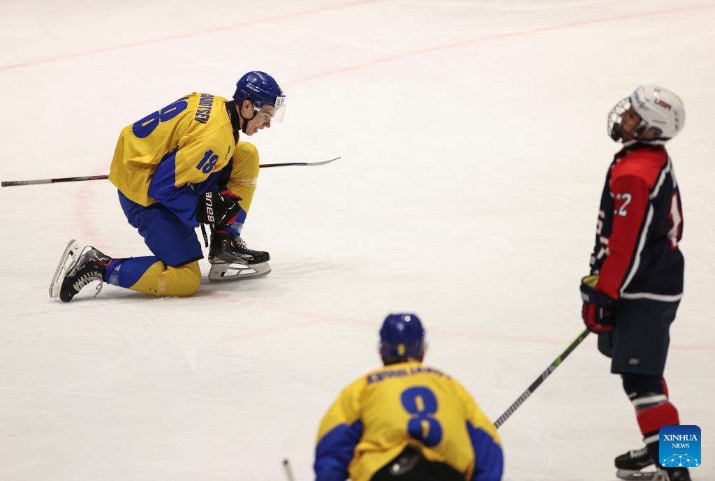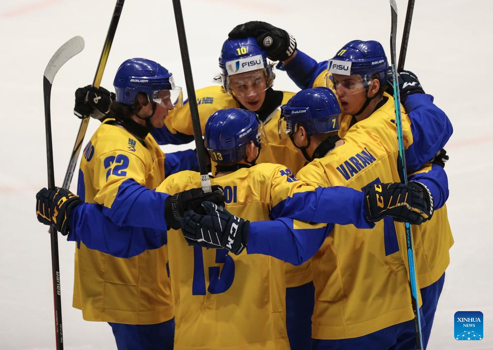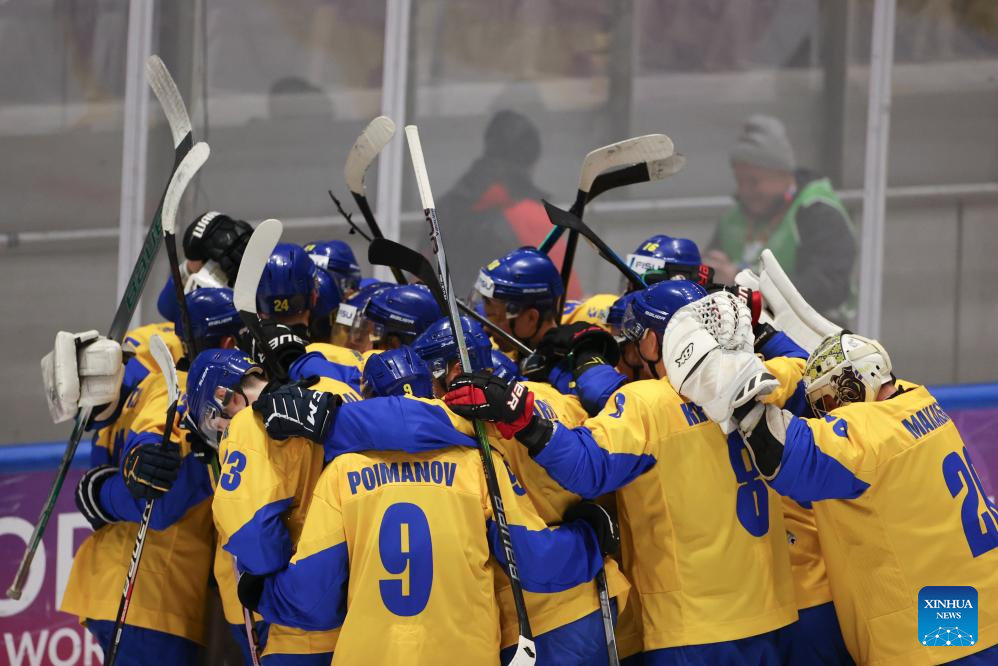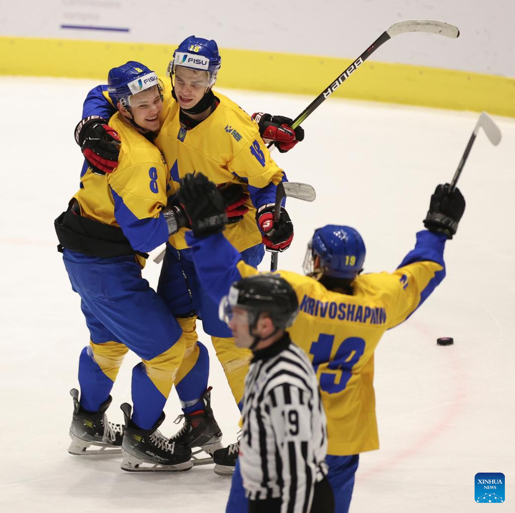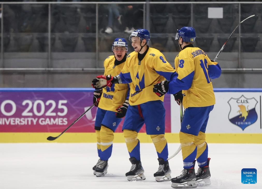 Nikita Kruhliakov (C) of Ukraine celebrates scoring during the ice hockey men's bronze medal match between Ukraine and the United States at the 2025 FISU Winter World University Games in Turin, Italy, Jan. 22, 2025. (Xinhua/Li Jing)