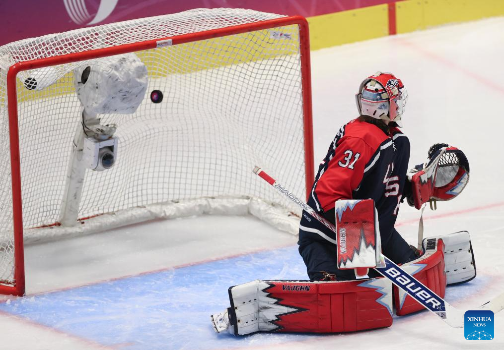 Konrad Werner Kausch, goalkeeper of the United States, fails to save the puck during the ice hockey men's bronze medal match between Ukraine and the United States at the 2025 FISU Winter World University Games in Turin, Italy, Jan. 22, 2025. (Xinhua/Li Jing)