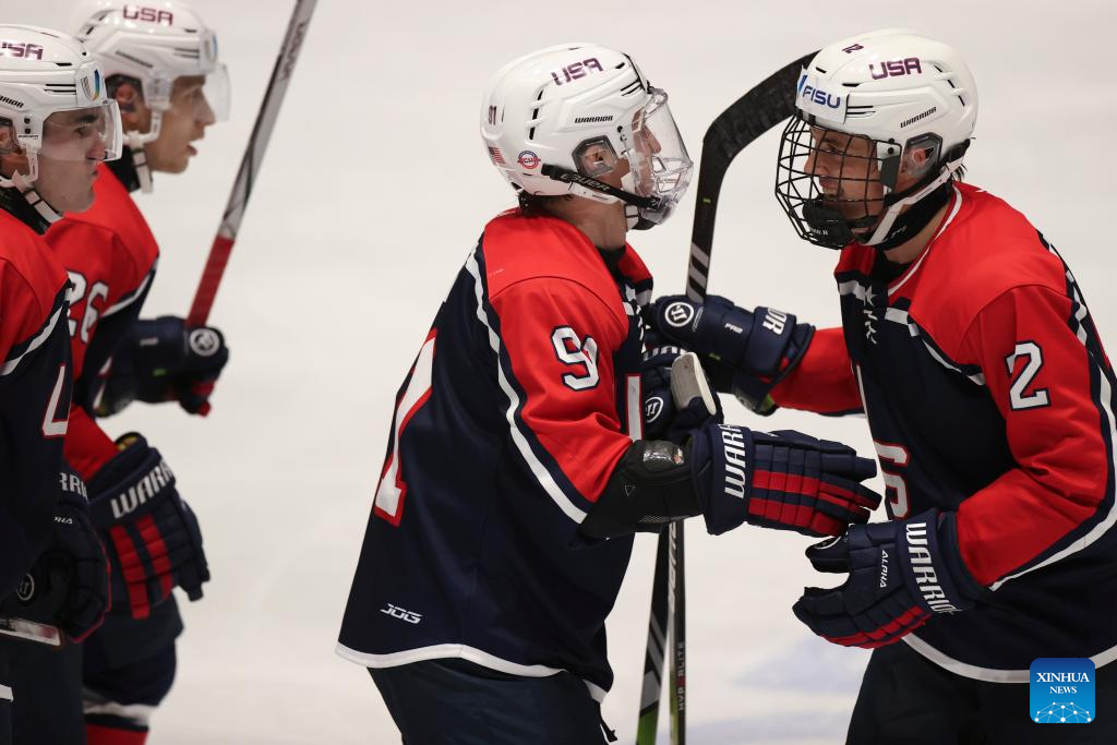 Players of the United States celebrate during the ice hockey men's bronze medal match between Ukraine and the United States at the 2025 FISU Winter World University Games in Turin, Italy, Jan. 22, 2025. (Xinhua/Li Jing)