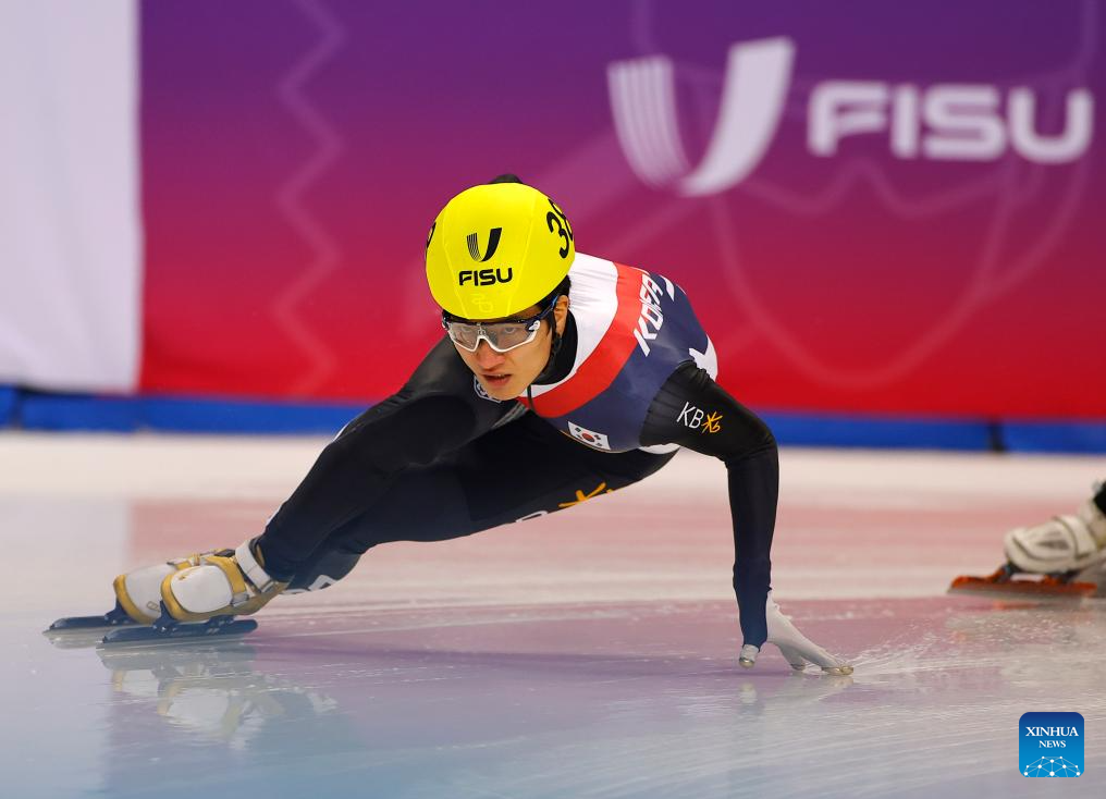 Kim Taesung of South Korea competes during the short track speed skating men's 500m Final A at the Torino 2025 FISU World University Winter Games in Turin, Italy, Jan. 22, 2025. (Xinhua/Ding Xu)