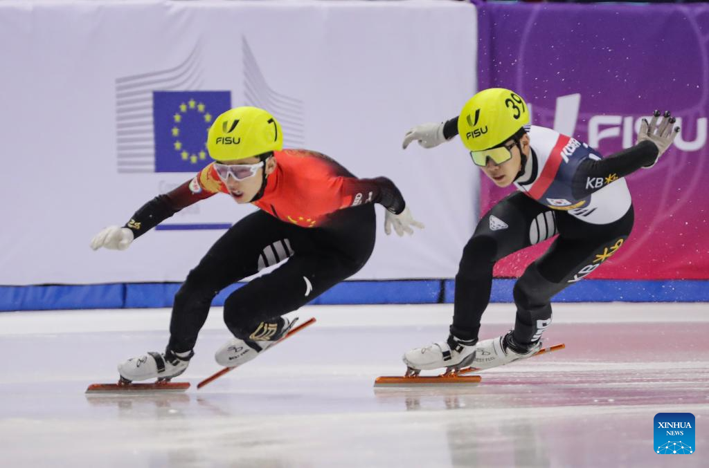 Song Guixu (L) of China and Lee Donghyun of Korea compete during the short track speed skating men's 500m Final A at the Torino 2025 FISU World University Winter Games in Turin, Italy, Jan. 22, 2025. (Xinhua/Zhang Fan)