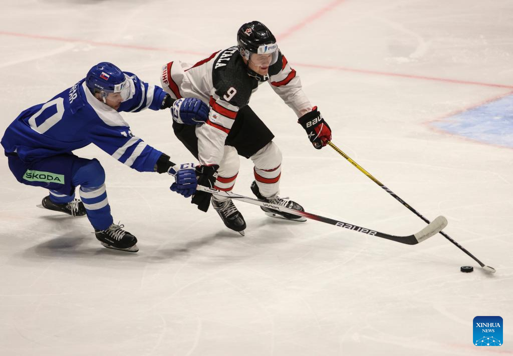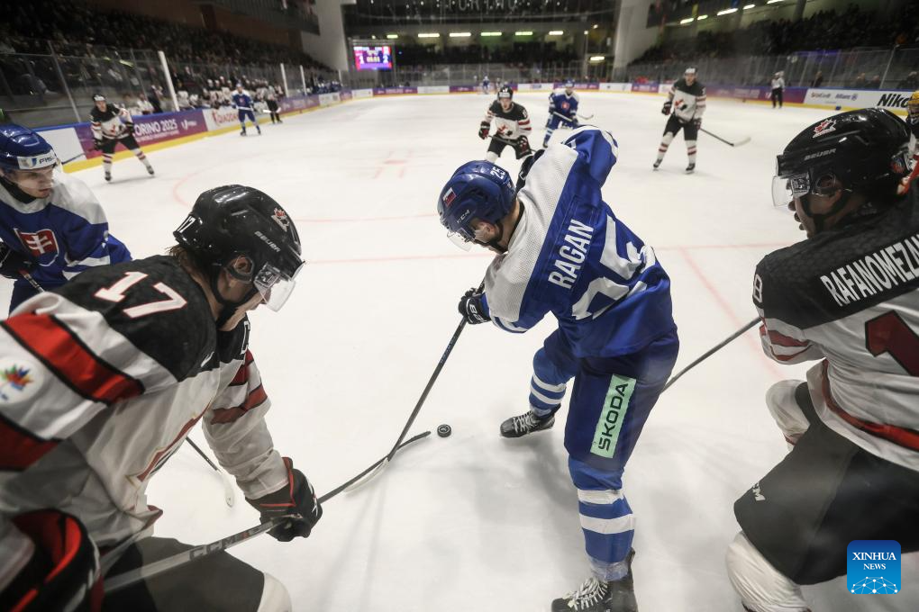 Jozef Hascak (C) of Slovakia competes during the ice hockey men's final match between Slovakia and Canada at the 2025 FISU Winter World University Games in Turin, Italy, Jan. 22, 2025. (Xinhua/Li Jing)