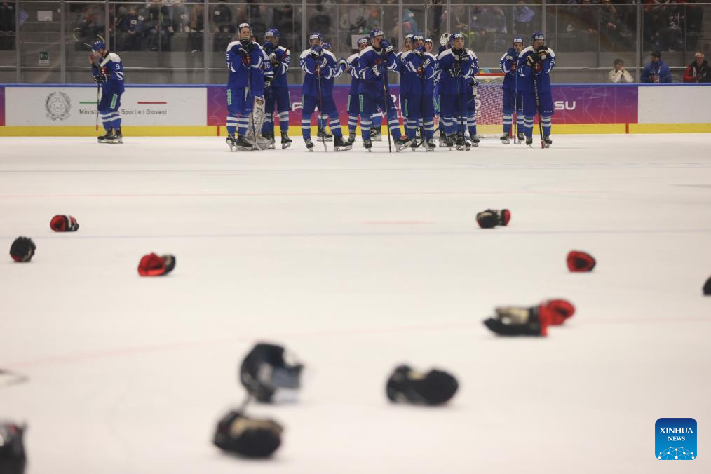Players of Slovakia react after the ice hockey men's final match between Slovakia and Canada at the 2025 FISU Winter World University Games in Turin, Italy, Jan. 22, 2025. (Xinhua/Li Jing)