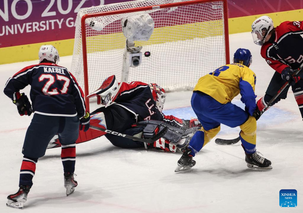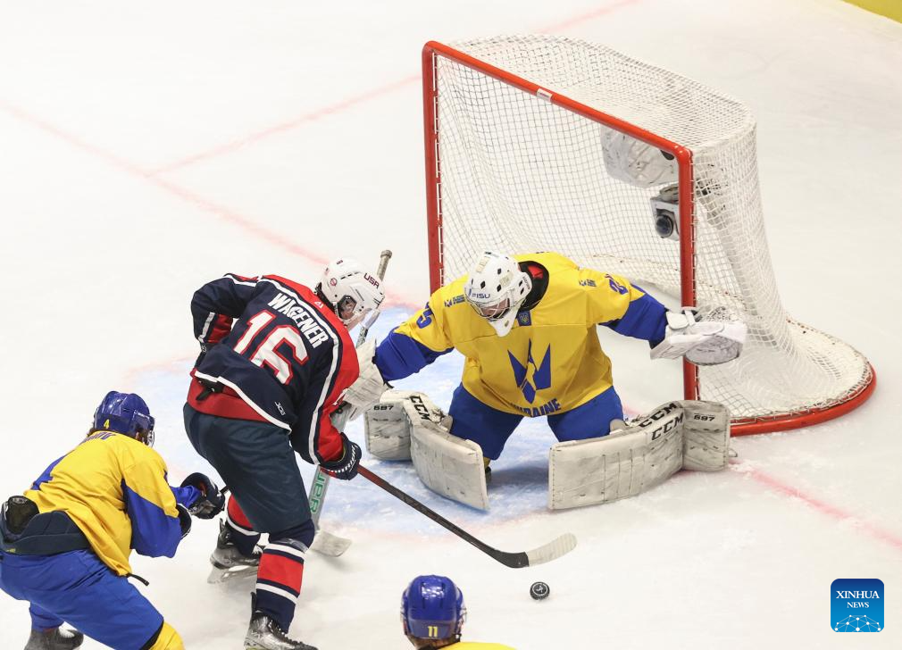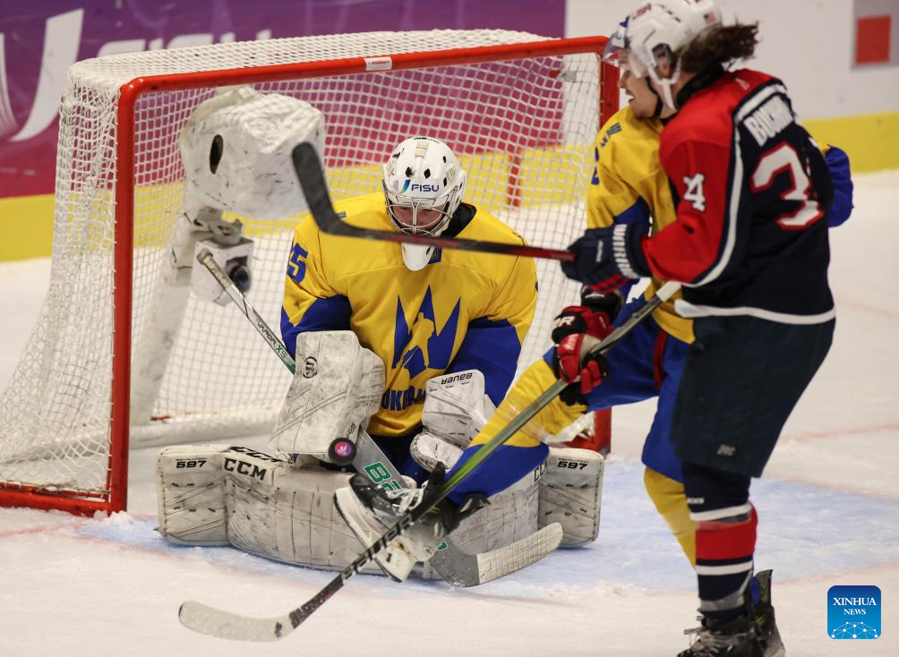 Artem Tselohorodtsev (2nd R) of Ukraine shoots at goal during the ice hockey men's bronze medal match between Ukraine and the United States at the 2025 FISU Winter World University Games in Turin, Italy, Jan. 22, 2025. (Xinhua/Li Jing)