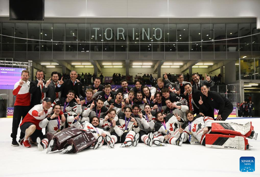 Players of Canada pose for photos after the ice hockey men's final match between Slovakia and Canada at the 2025 FISU Winter World University Games in Turin, Italy, Jan. 22, 2025. (Xinhua/Li Jing)