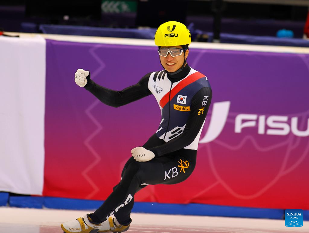 Kim Taesung of South Korea celebrates after winning the short track speed skating men's 500m Final A at the Torino 2025 FISU World University Winter Games in Turin, Italy, Jan. 22, 2025. (Xinhua/Ding Xu)