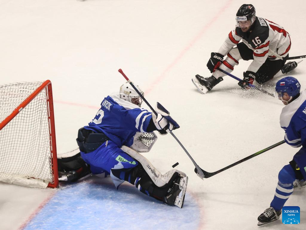 Patrik Andrisik, goalkeeper of Slovakia, fails to save the shot form Sasha Mutala of Canada during the ice hockey men's final match between Slovakia and Canada at the 2025 FISU Winter World University Games in Turin, Italy, Jan. 22, 2025. (Xinhua/Li Jing)
