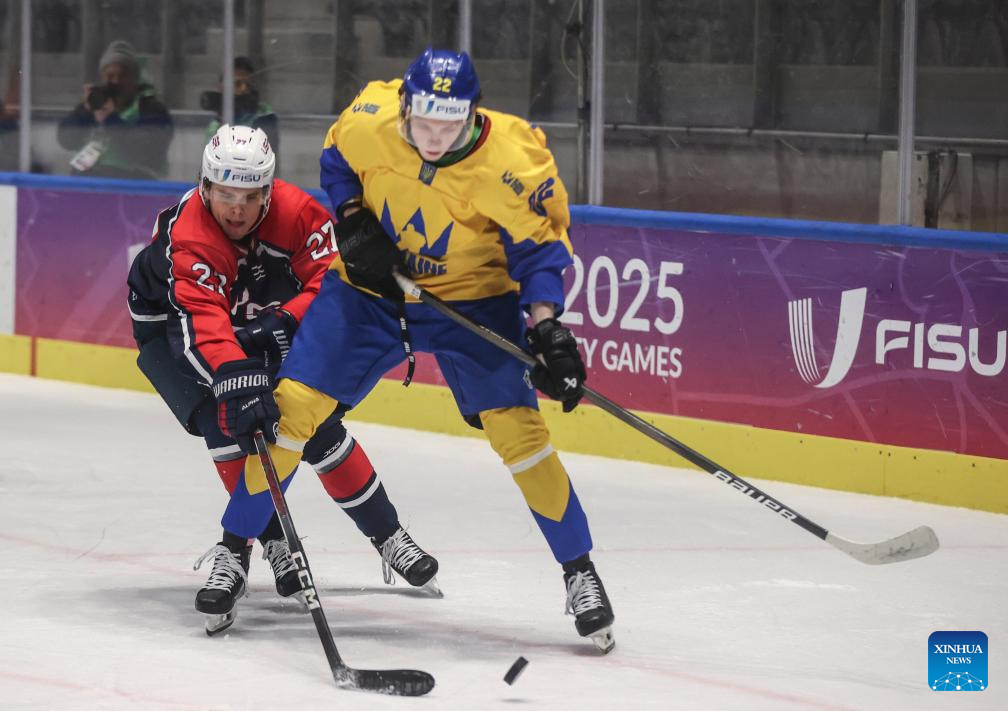 Mykyta Sydorenko (R) of Ukraine vies with Lazarus John Kaebel of the United States during the ice hockey men's bronze medal match between Ukraine and the United States at the 2025 FISU Winter World University Games in Turin, Italy, Jan. 22, 2025. (Xinhua/Li Jing)