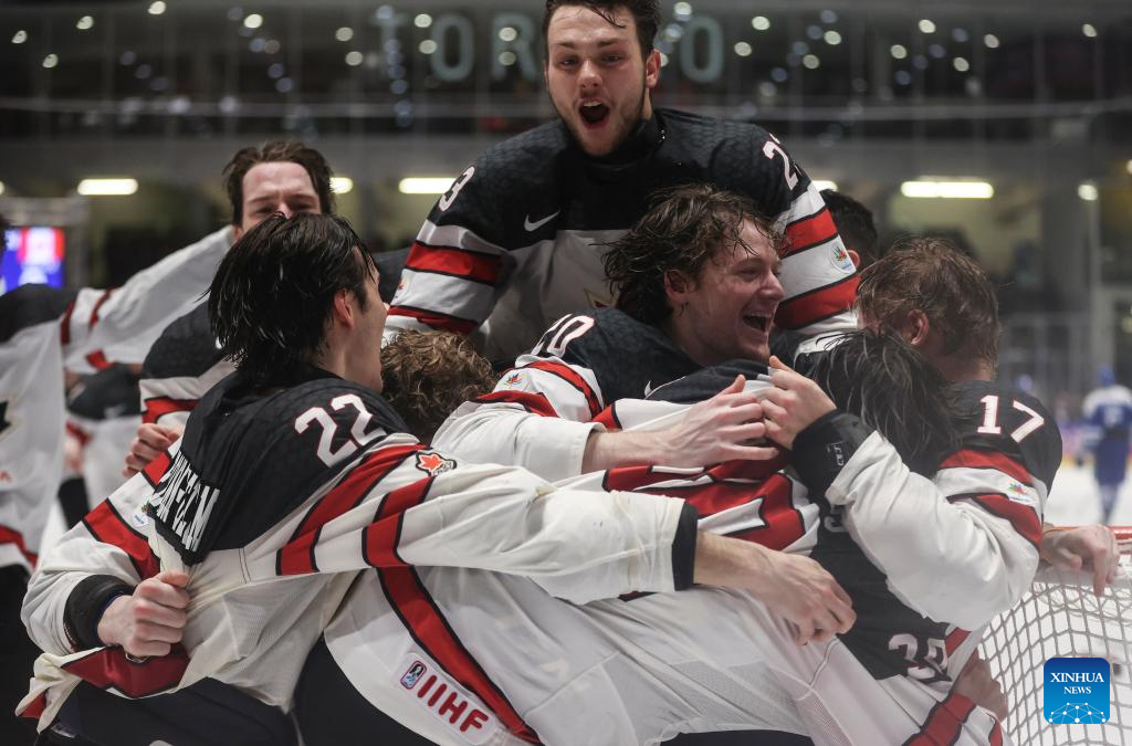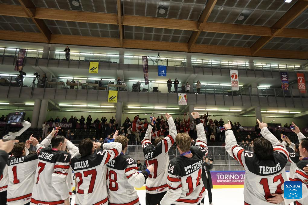 Players of Canada celebrate after the ice hockey men's final match between Slovakia and Canada at the 2025 FISU Winter World University Games in Turin, Italy, Jan. 22, 2025. (Xinhua/Li Jing)