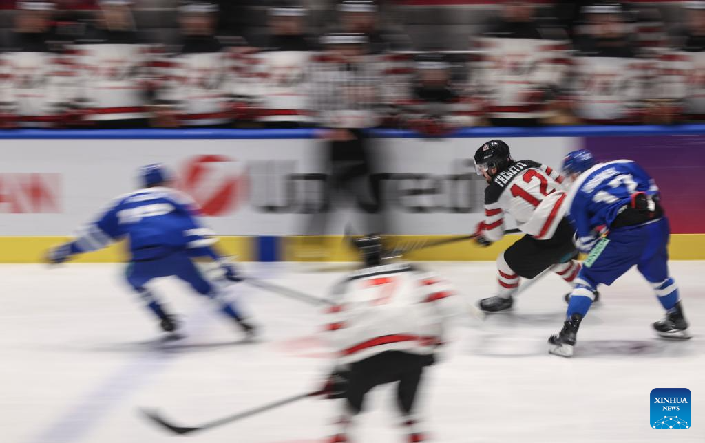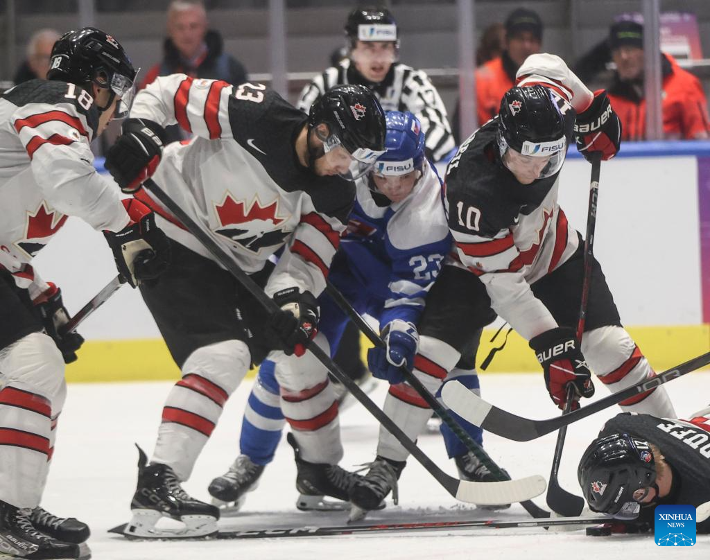Conor Tadd Frenette (2nd R) competes during the ice hockey men's final match between Slovakia and Canada at the 2025 FISU Winter World University Games in Turin, Italy, Jan. 22, 2025. (Xinhua/Li Jing)