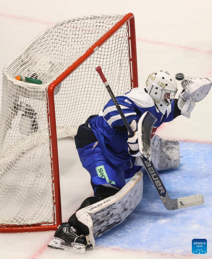 Patrik Andrisik (L), goalkeeper of Slovakia, makes a save during the ice hockey men's final match between Slovakia and Canada at the 2025 FISU Winter World University Games in Turin, Italy, Jan. 22, 2025. (Xinhua/Li Jing)
