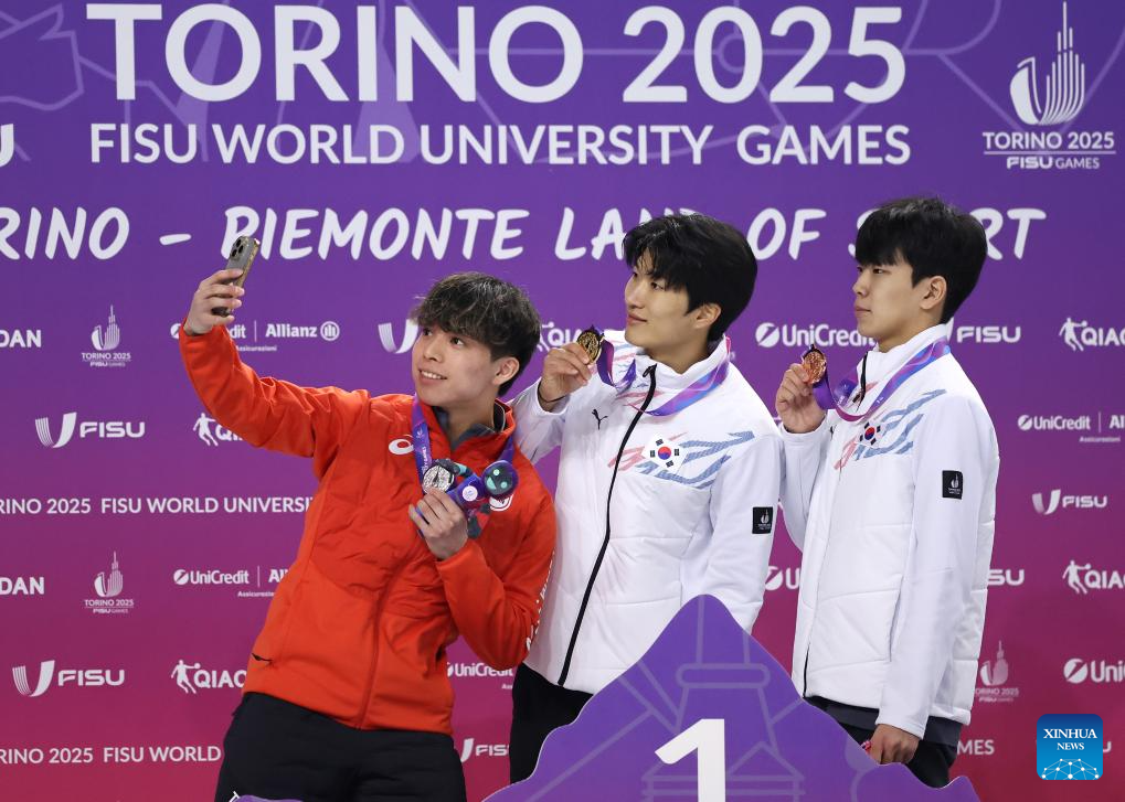 Silver medalist Miyata Shogo (L) takes a selfie with gold medalist Kim Taesung (C) of South Korea and bronze medalist Lee Donghyun of South Korea at the awarding ceremony of the short track speed skating men's 500m at the Torino 2025 FISU World University Winter Games in Turin, Italy, Jan. 22, 2025. (Xinhua/Zhang Chen)