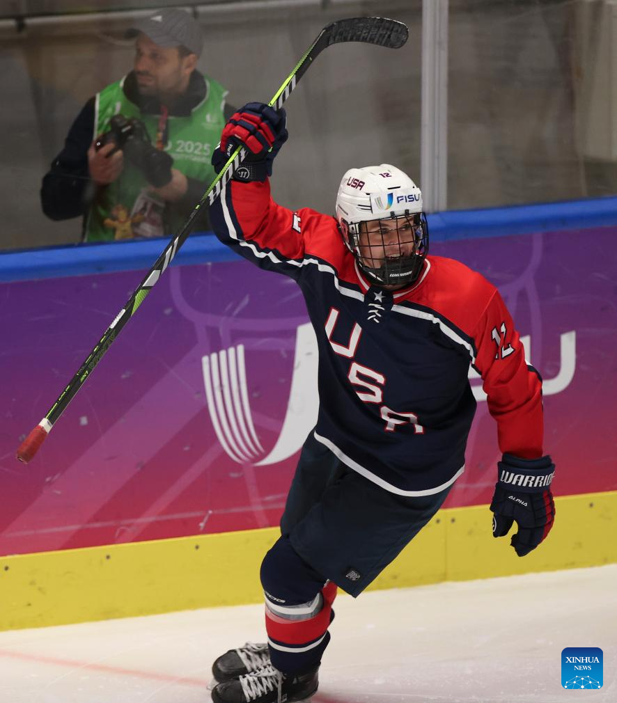 Sebastian James Smith of the United States celebrates during the ice hockey men's bronze medal match between Ukraine and the United States at the 2025 FISU Winter World University Games in Turin, Italy, Jan. 22, 2025. (Xinhua/Li Jing)