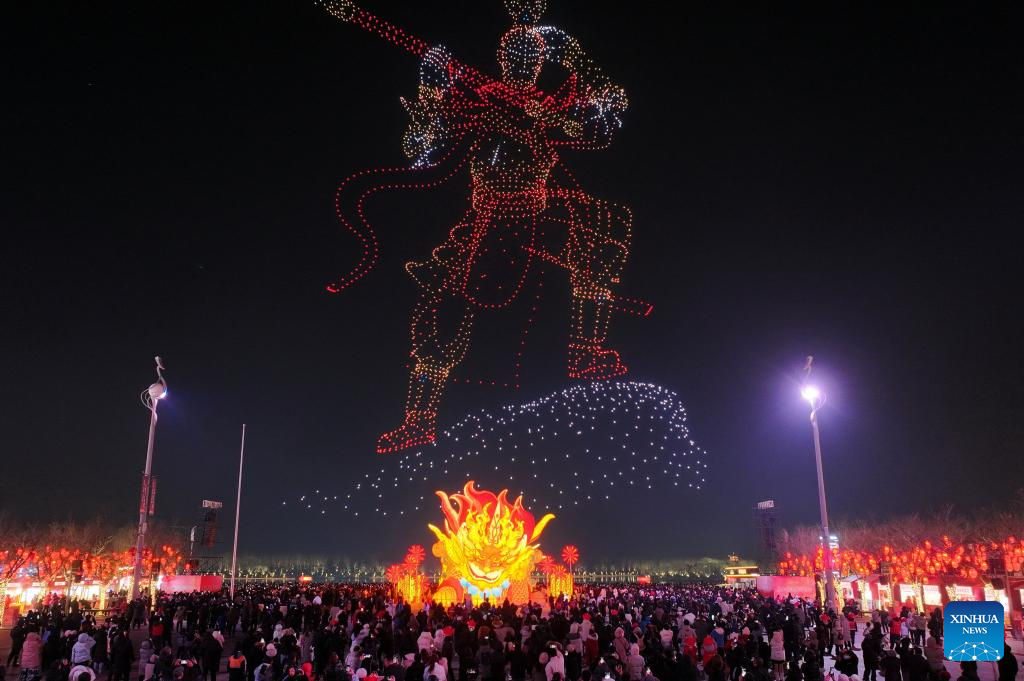An aerial drone photo taken on Jan. 22, 2025 shows people watching a drone performance during the Tangshan Nanhu Spring Festival lantern fair in Tangshan, north China's Hebei Province. The 2025 Tangshan Nanhu Spring Festival lantern fair opened here on Wednesday, which will last until March 1. (Xinhua/Yang Shiyao)