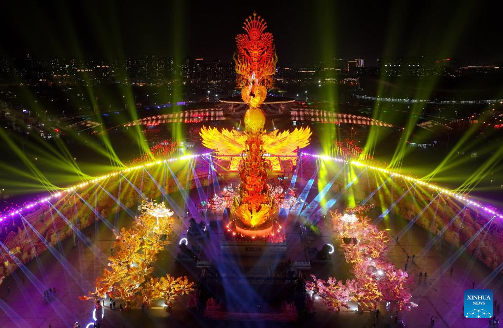 An aerial drone photo taken on Jan. 22, 2025 shows people visiting the a Spring Festival lantern fair in Tangshan, north China's Hebei Province. The 2025 Tangshan Nanhu Spring Festival lantern fair opened here on Wednesday, which will last until March 1. (Xinhua/Yang Shiyao)