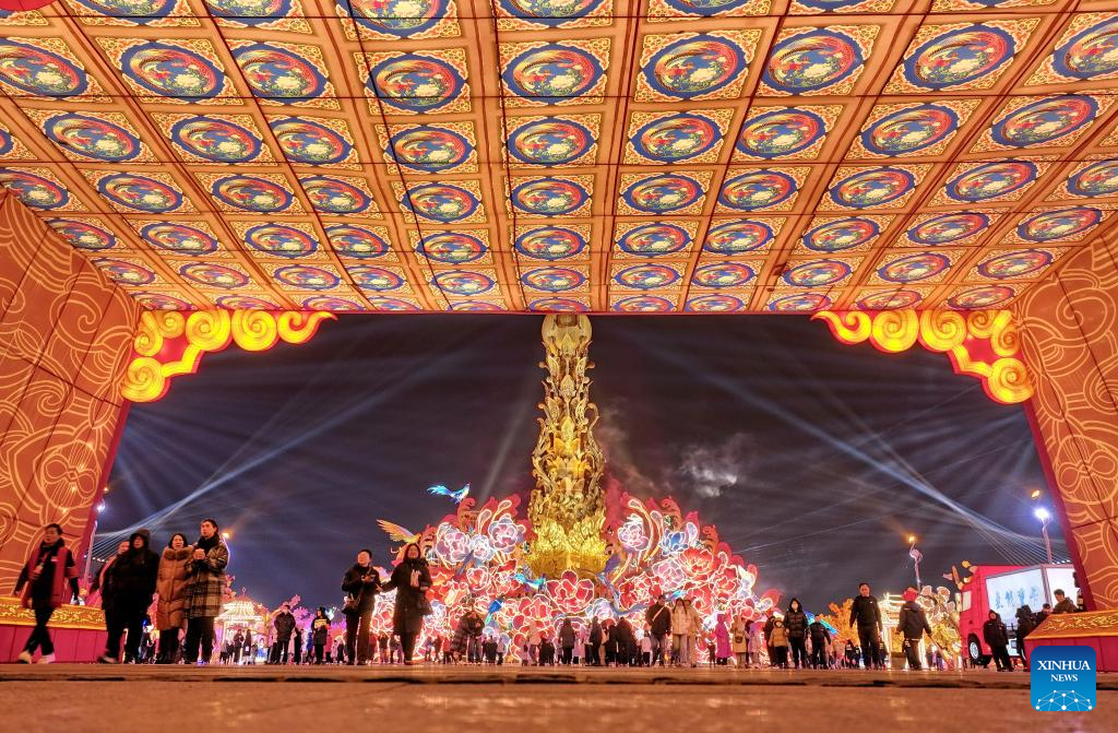 This photo taken on Jan. 22, 2025 shows people visiting the Tangshan Nanhu Spring Festival lantern fair in Tangshan, north China's Hebei Province. The 2025 Tangshan Nanhu Spring Festival lantern fair opened here on Wednesday, which will last until March 1. (Xinhua/Yang Shiyao)