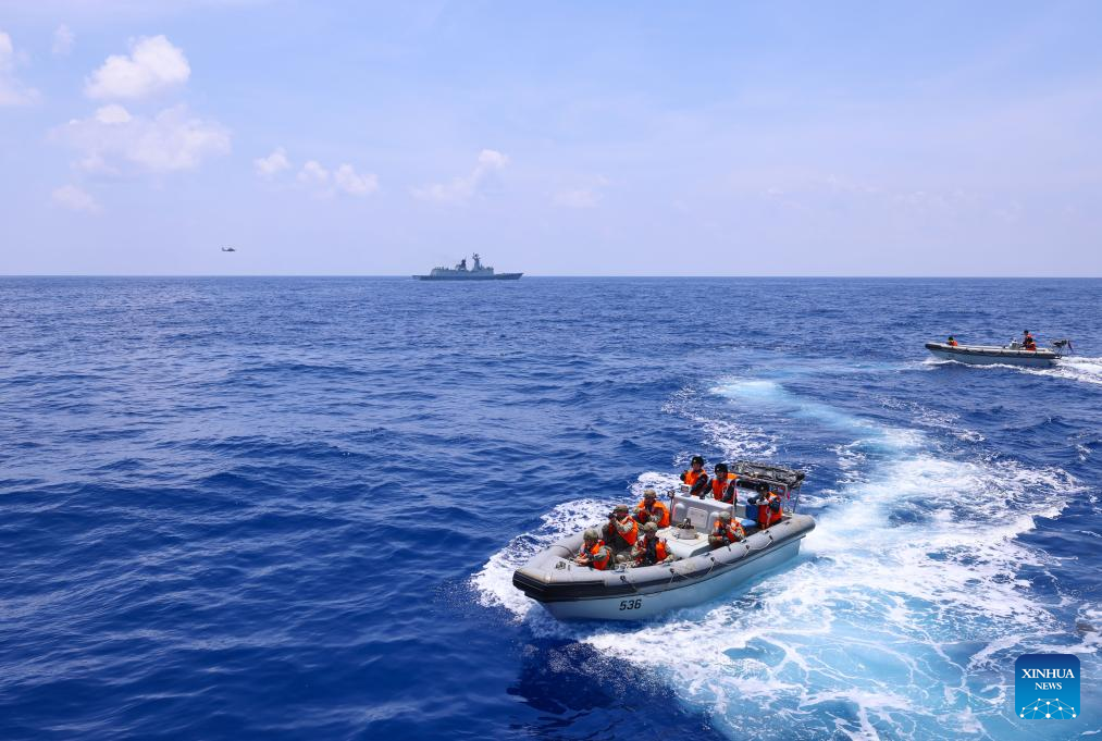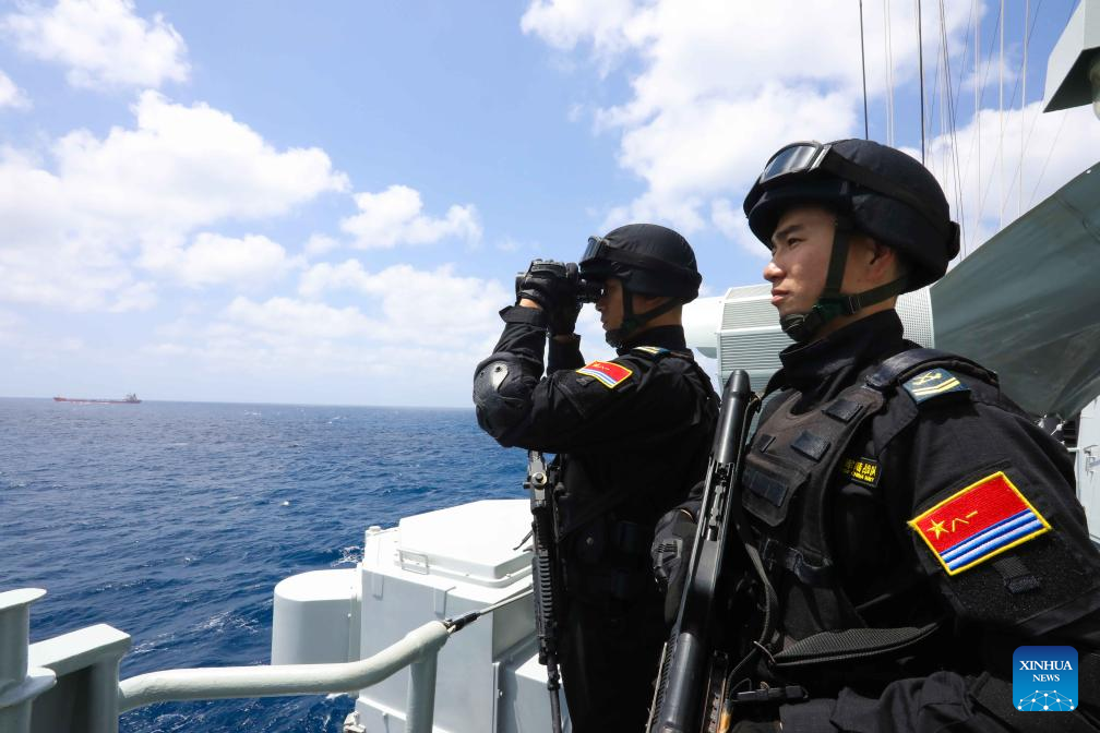 This file photo taken on Oct. 26, 2024 shows soldiers of the 46th fleet of the Chinese People's Liberation Army Navy participating in an counter-terrorism and anti-piracy exercise. A Chinese navy fleet returned to a military port in the coastal city of Zhanjiang, south China's Guangdong Province, on Friday after completing escort missions and joint exercises. Setting off on Feb. 21, 2024 from Zhanjiang, the 46th fleet of the Chinese People's Liberation Army Navy traveled over 160,000 nautical miles during its 339-day voyage, escorting ships during missions in the Gulf of Aden and the waters off Somalia. (Photo by Yu Zeming/Xinhua)