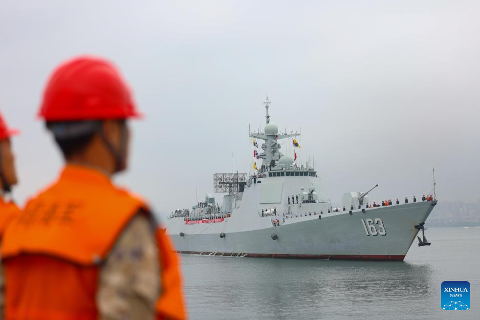 The guided-missile destroyer Jiaozuo of the 46th fleet of the Chinese People's Liberation Army Navy approaches a military port in Zhanjiang City in south China's Guangdong Province, Jan. 24, 2025. A Chinese navy fleet returned to a military port in the coastal city of Zhanjiang, south China's Guangdong Province, on Friday after completing escort missions and joint exercises.